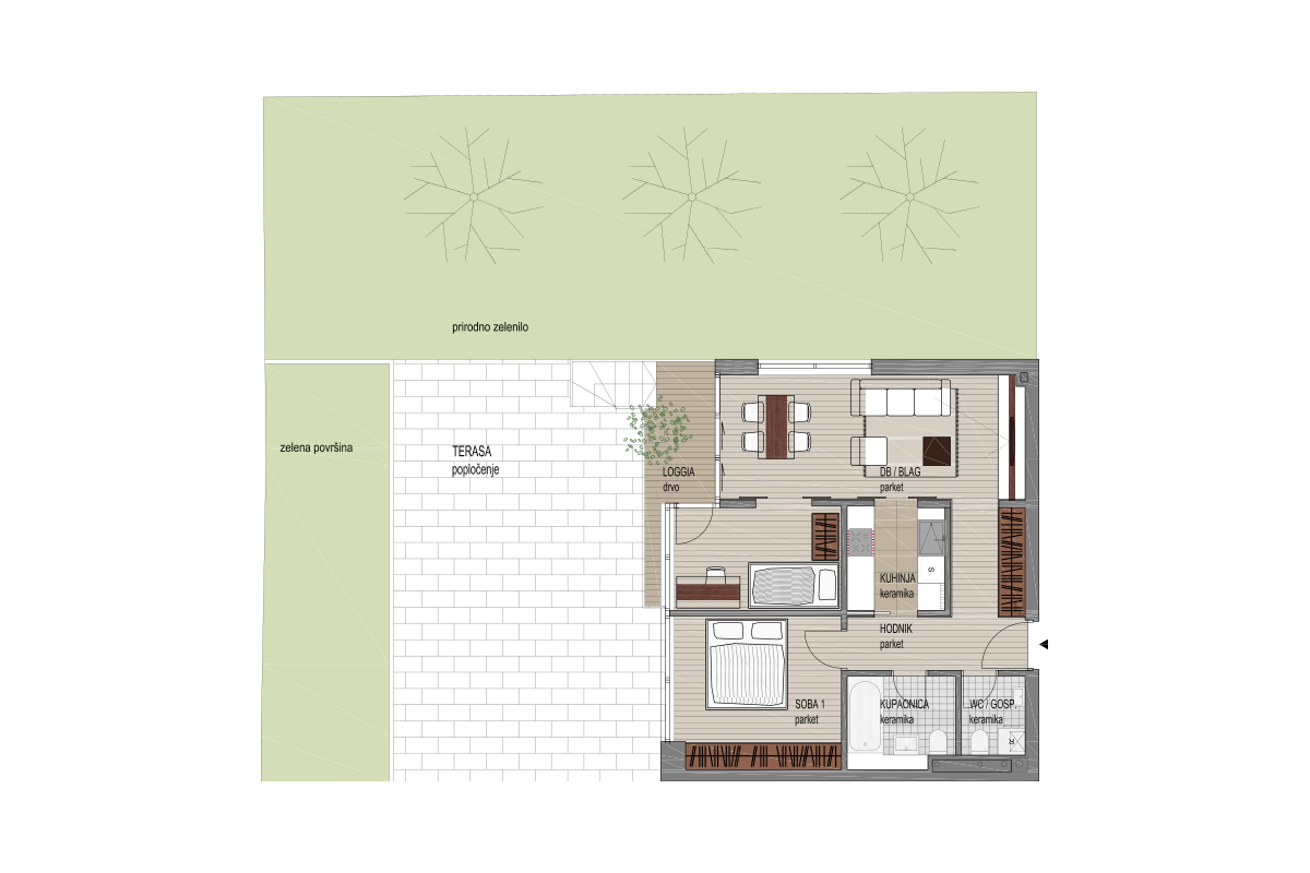 Trosobni stan površine 60 m2 nalazi se u prizemlju s lođom, velikom terasom i zelenom površinom a orijentacija stana je SJEVER-ZAPAD. Ugrađena vanjska aluminijsko-drvena (ariš) stolarija  i električna sjenila na prozorima, klima uređaj te protuprovalna vrata. Dnevni boravak, spavaća soba i ulaz opremljeni su hrastovim parketom rađenim za izvoz. Kuhinja, kupaonica i WC opremljeni su Marazzi keramičkim pločicama i sanitarijama Hatria.