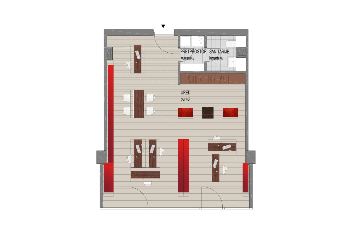 Uredski prostor 66 m2 na prvom katu. Orijentacija ureda je JUG. Uredski prostor je otvorenog tipa s mogućnošću prilagodbe / pregradnje prema potrebi. Uredski prostor opremljen je vanjskom aluminijsko-drvenom (ariš) stolarijom i električnim sjenilima na prozorima, klima uređajem, hrastovim parketom u uredskom dijelu te keramičkim pločicama Marazzi i sanitarijama Hatria u dijelu pomoćnih prostorija (čajna kuhinja i WC).