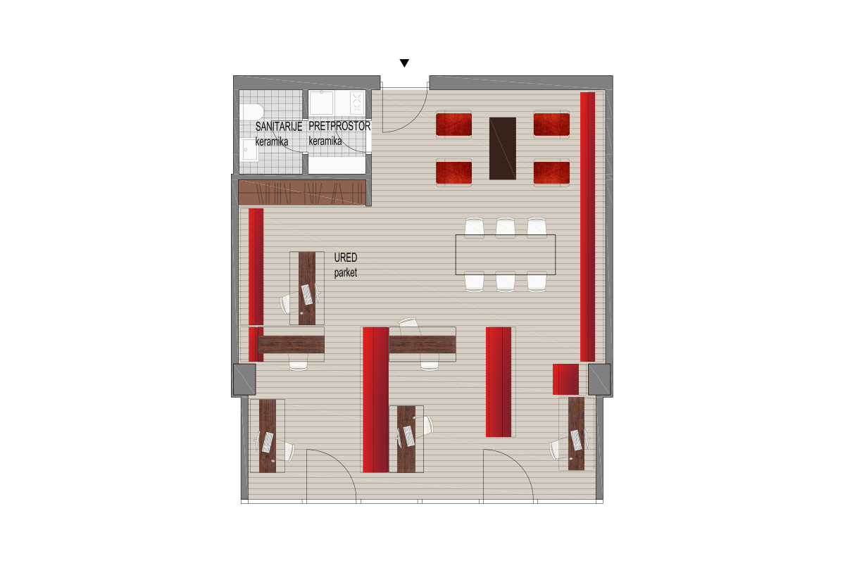 Uredski prostor 74 m2 na drugom katu. Orijentacija ureda je JUG. Uredski prostor je otvorenog tipa s mogućnošću prilagodbe / pregradnje prema potrebi. Uredski prostor opremljen je vanjskom aluminijsko-drvenom (ariš) stolarijom i električnim sjenilima na prozorima, klima uređajem, hrastovim parketom u uredskom dijelu te keramičkim pločicama Marazzi i sanitarijama Hatria u dijelu pomoćnih prostorija (čajna kuhinja i WC).